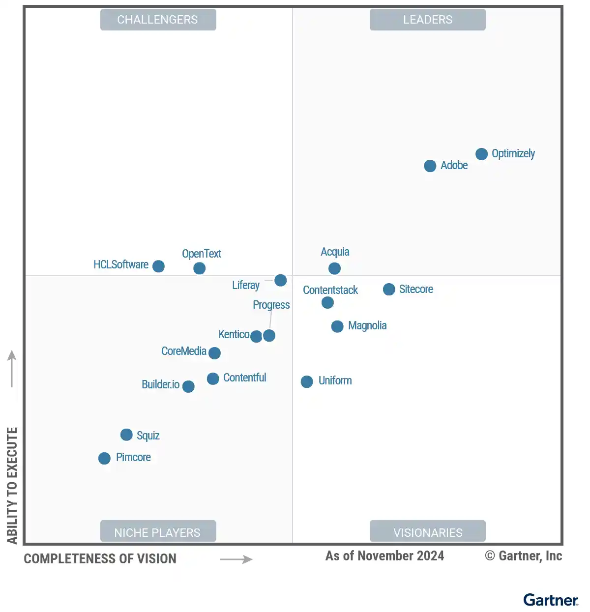 The Gartner Magic Quadrant for DXP also provides a visual representation placing vendors into one of four quadrants: Leaders, Challengers, Visionaries, and Niche Players.