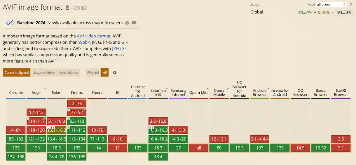Is it that urgent? Yes, right away. The reasons are that AVIF provides smaller file sizes—meaning stronger compression—and, on top of that, better quality. And to crown it all, it is already supported by the vast majority of browsers, specifically 94.33% of them, according to Can I Use.