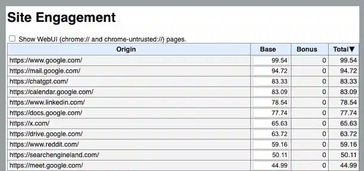 Yes, it does—and checking it is surprisingly simple. All you need to do is open your Google Chrome browser and type the following into the address bar: chrome://site-engagement/. Once you hit enter, you’ll be presented with engagement stats that show your loyalty to the websites you visit.